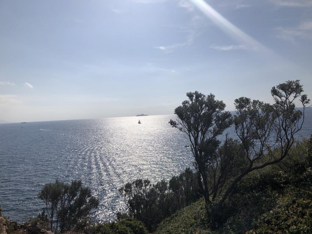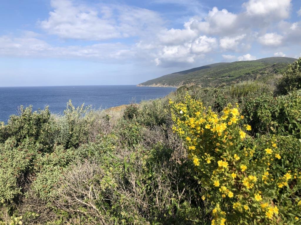 Vista panoramica dall'Osservatorio di Punta Falcone, mare e cielo azzurro a Suvereto, Val di Cornia.