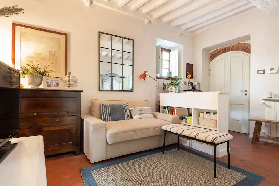 Quando il tempo invita a restare in casa, il soggiorno diventa il cuore accogliente della casa: uno spazio piccolo e rilassante dove sentirsi subito a proprio agio. Potrai guardare la TV con accesso a Netflix, dedicarti al lavoro o alla lettura alla comoda scrivania e lasciarti avvolgere dall’eleganza dell’arredamento in autentico stile toscano, valorizzato da un’antica madia in legno che racconta la storia del luogo.