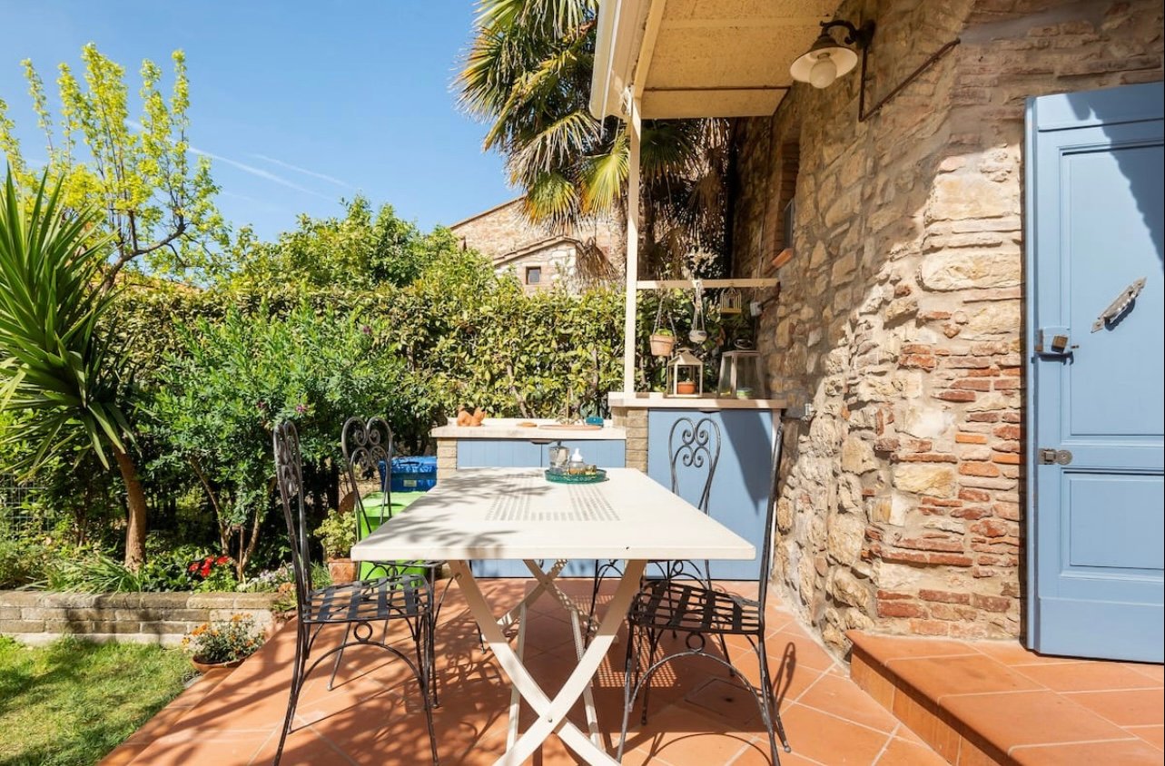 Dal soggiorno si accede a un grande bagno con doccia walk-in, alla camera matrimoniale, dotata di piccolo bagno privato con vista sul giardino, e alla camera con il letto a castello, perfetta per i bambini. Scendendo una scala in cotto si accede al piano inferiore, con la cucina attrezzata dalla quale entrate in  giardino.