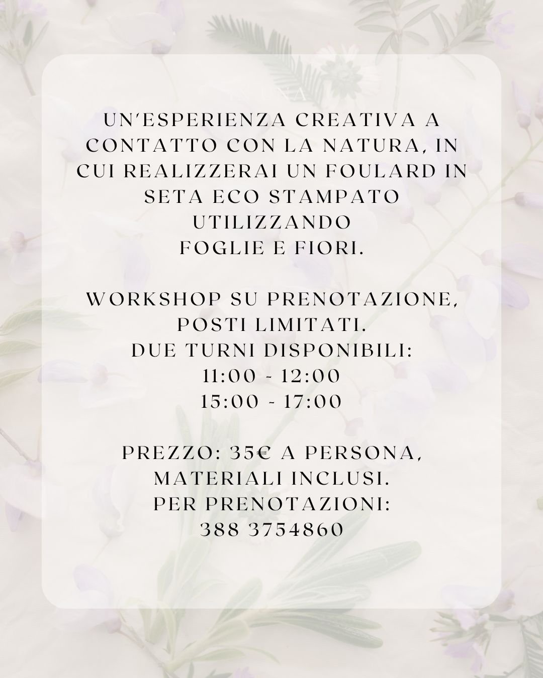 Durante il festival, La Casa nel Castello ospiterà un bellissimo workshop nello Spazio Creativo. Si tratta di un laboratorio di eco-printing, realizzato in collaborazione con Anima di Foglia, un brand etico e responsabile che realizza capi di abbigliamento con stampa ecologica. Durante il workshop sarà possibile realizzare un foulard in seta decorato utilizzando elementi della natura. Per partecipare è necessario prenotarsi a uno dei i due turni in progamma ore 11.00 e ore 15.00.